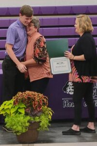 As Grantsburg Member Service Reps, Cindy & Bridget, awarded the $750 Scholarship to Alex Nelson, Grandma Cindy snuck in a congratulatory, warm hug with her winning grandson.